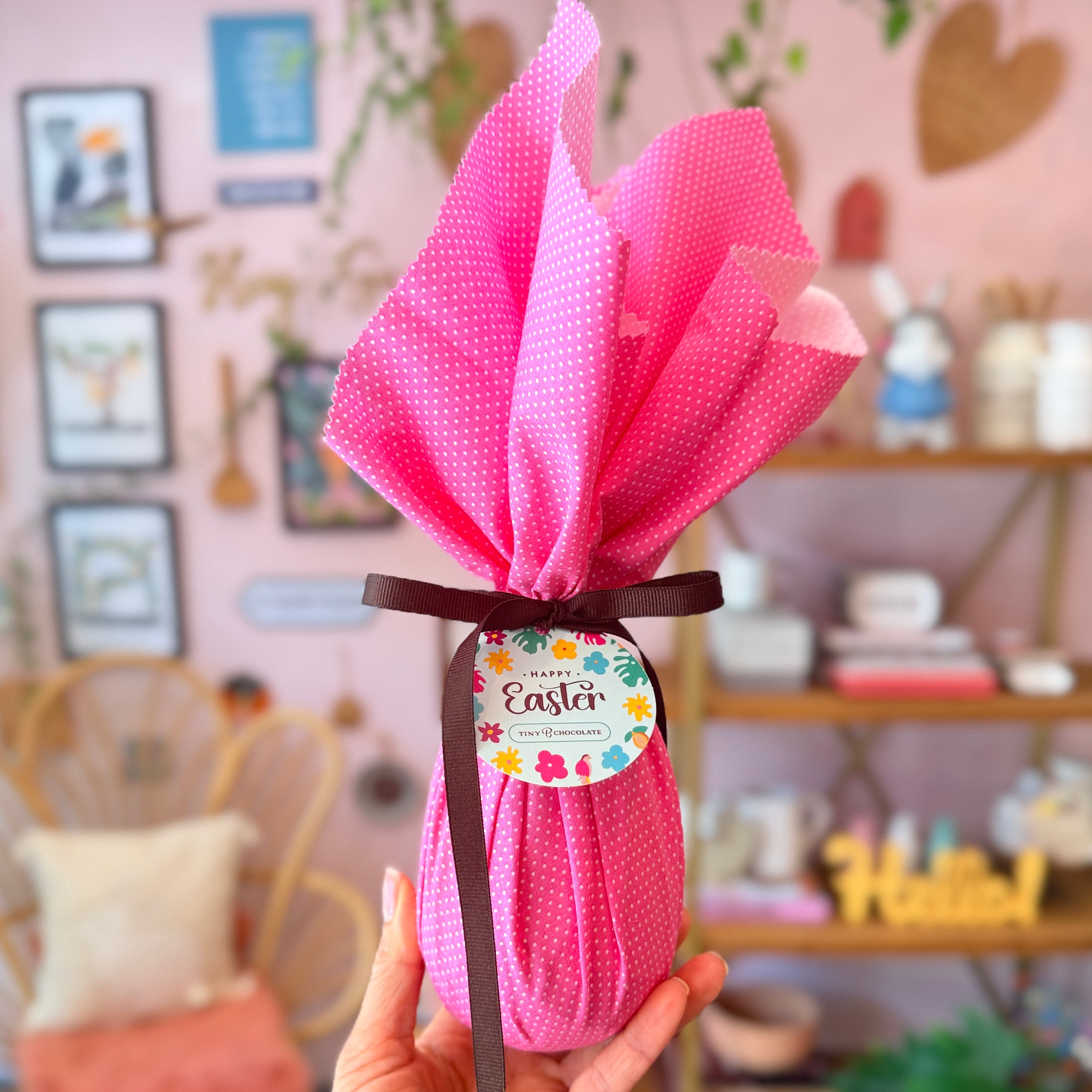 Each egg is carefully made by hand and wrapped in fabric with a beautiful ribbon, our signature touch for Easter.